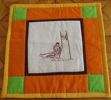 Sportowa poduszkę dla Mateusza z wyhaftowanym przez Eni narciarzem uszyła