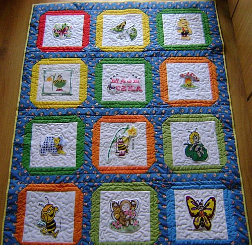 Pomocą w wytężonej pracy będzie uszyta przez JoannęMarię kwiatowa kołderka, która przypomina pełną skrzydlatych gości łąkę.