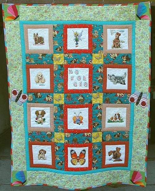 Kołderkowe ciocie wyczarowały na kwadracikach wielu róznych szczekających przyjaciół Karolci.