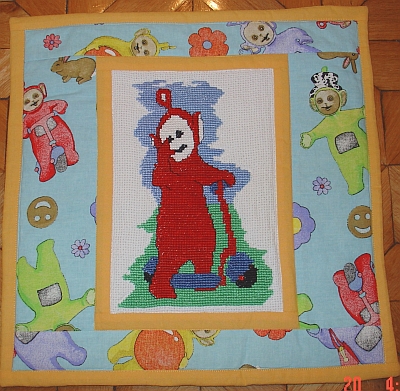Braciszek Aruś otrzymał poduszeczkę z teletubisiem uszytą przez Pierzastą.