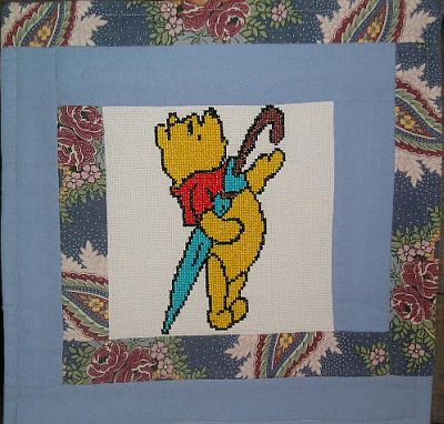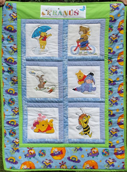 miała całe mnóstwo. Efektem jej działań jest piękna kołderka, z dużą ilością błękitu, idealna dla maluszka, który lubi bohaterów Stumilowego Lasu.