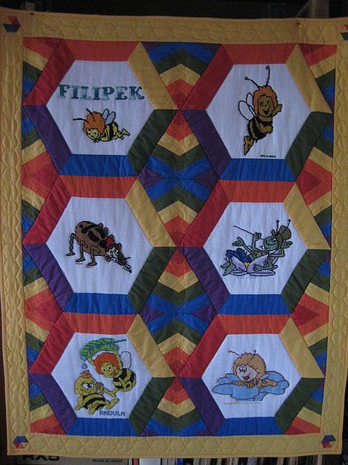 A w kolorowych ramkach umieściła świat, w którym mieszka malutka pszczółka Maja, która wszyscy kochają. Wraz z nią na kołderce pojawił się Gucio, którego Maja