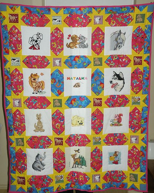 Na kołderce pojawili się mieszkańcy naszych domów, parków i lasów: ruda wiewiórka, sarenka, kotek, koń i nieśmiala myszka.