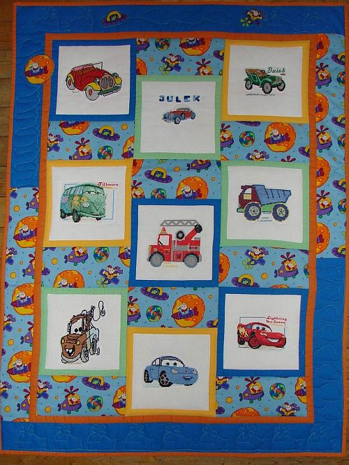 Beata z Brukseli uszyła dla niego motoryzacyjną kołderkę w różnych odcieniach niebieskiego z ciekawymi pikowankami.