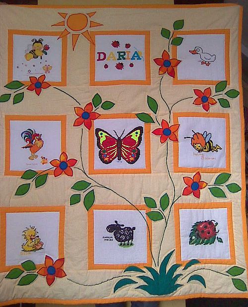 AgataJ z Wrocławia uszyła przecudną kolderkę z roślinnymi aplikacjami. Wśród kwitnących kwiatków uwijają się biedroneczki
