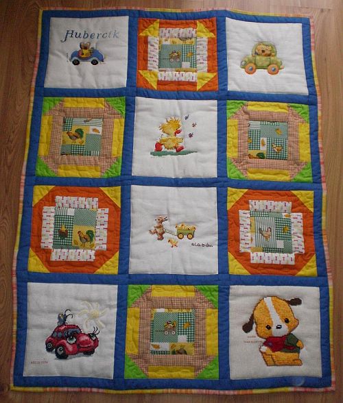 która połączyła patchworkowe bloki z haftowanymi kwadracikami i wyczarowała piękną, kolorową przytulankę z niebieskimi ramkami. W ten sposób Hubercik
