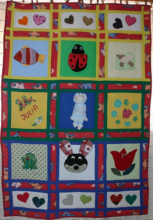 sztruks, sznureczki, wełniane supełki. A na kwadracikach figlują wśród barwnych kwiatów radosne zwierzaki: puchata owieczka, długouchy zajączek,