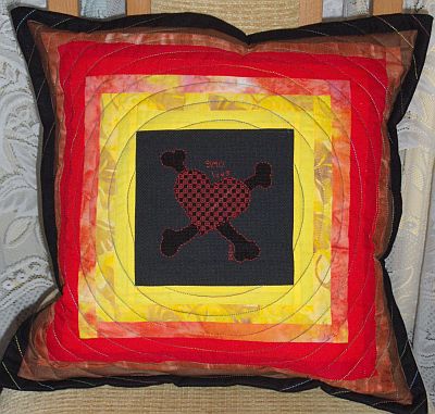 czerwonym haftem na czarnej kanwie.