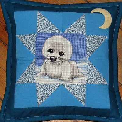 Edyta - siostra Roberta otrzymała uszytą przez Nikiyę poduszkę z wyszytą foczką.