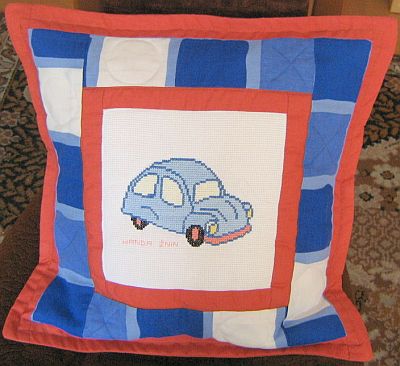 Kacper brat Zuzi otrzyma poduszkę z wyhaftowanym przez WandęS. ze Żnina błękitnym autem.