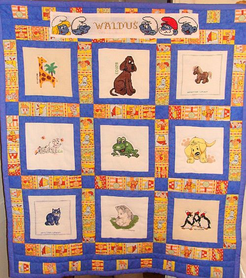 wyhaftowała piękny szyldzik, z którego do Waldusia uśmiecha się cała gromada smerfów na czele z Papą Smerfem.