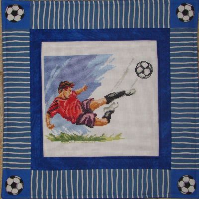 Konrad otrzymał poduszkę z piłkarzem wyhaftowanym przez Magdę z Warszawy