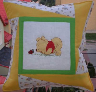 Ania otrzymała poduszeczkę z Kubusiem Puchatkiem wyhaftowanym przez Joaśkę a uszytą przez Kingę z Jędrzejowa