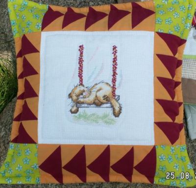ze ¶pi±cym na hu¶tawce kotkiem, wyhaftowanym przez Marzenę
